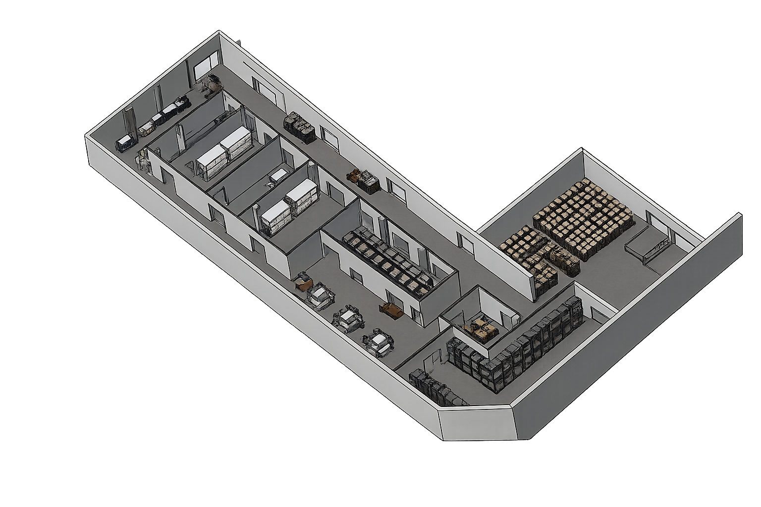 Work typically involves full 3D modelling of existing or planned facilities, supporting production line definition, storage layout, circulation paths, and scenario evaluation to assist planning, coordination, and decision-making processes.